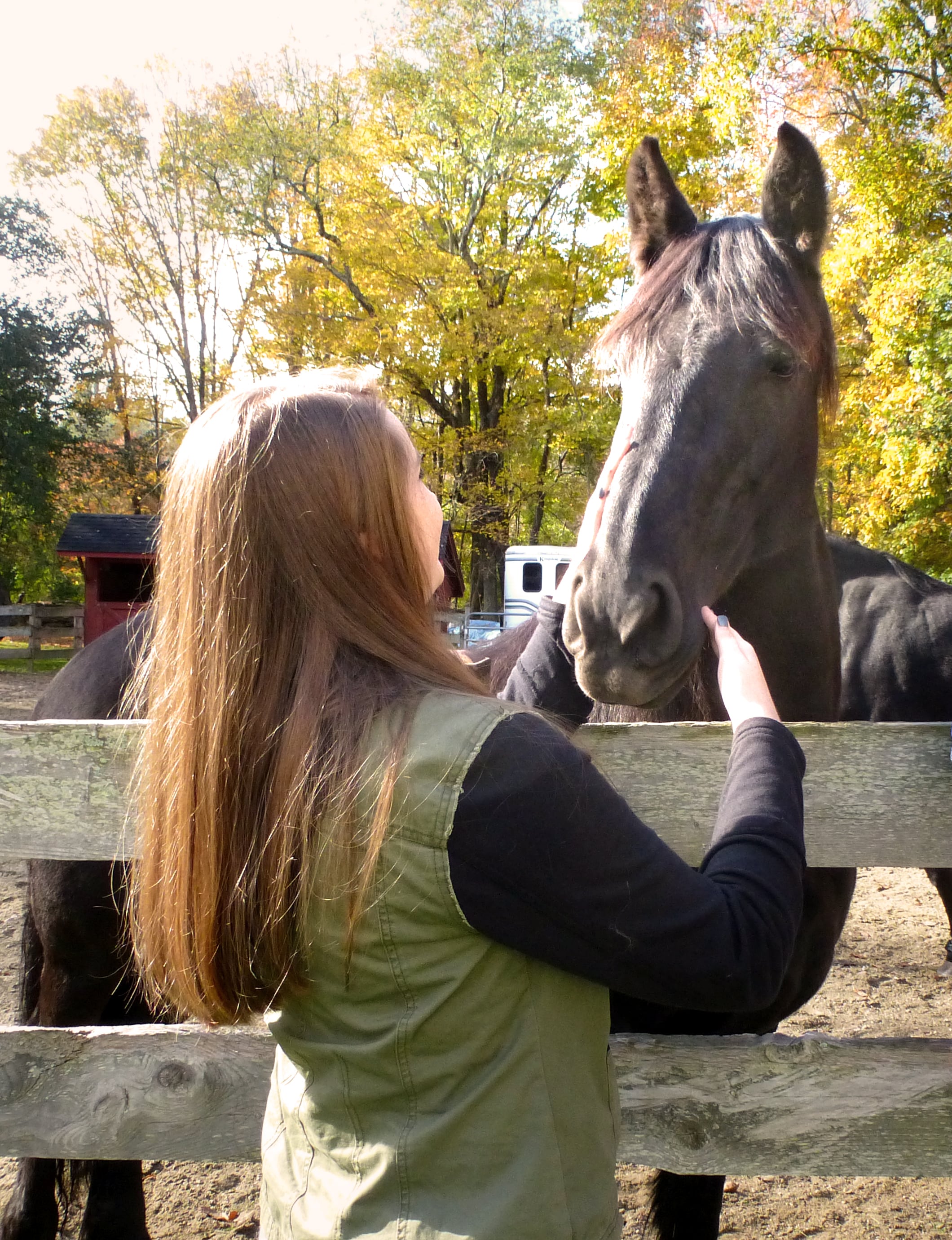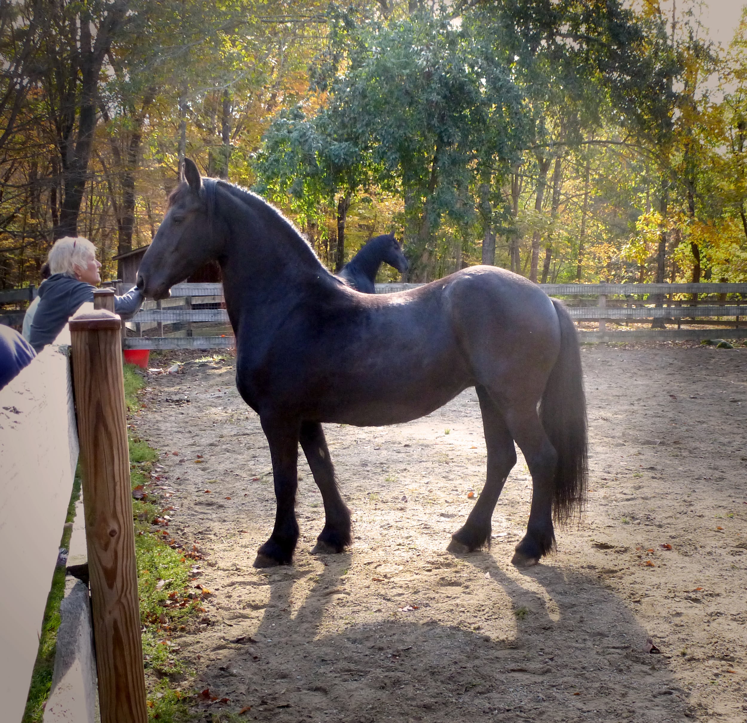 The black coat of the Friesian is its most easily recognized feature. Other obvious characteristics are the long, heavy mane and tail and the Shire-like fetlock hair. Color alone will not receive top ranking. Correct movement and carriage is also judged. Friesians are well known for their grace, intelligence, and great presence. This was in full display for us with Cora and Gracie stopping to hold the perfect pose for photographers then trotting to a new position to pose again. But these are not just 'show ponies'. It was obvious that they knew they were being adored and were more than willing to come to the fence and hold their heads out to be embraced, even waiting patiently for the more shy people to come to them.Walktober Walk #91